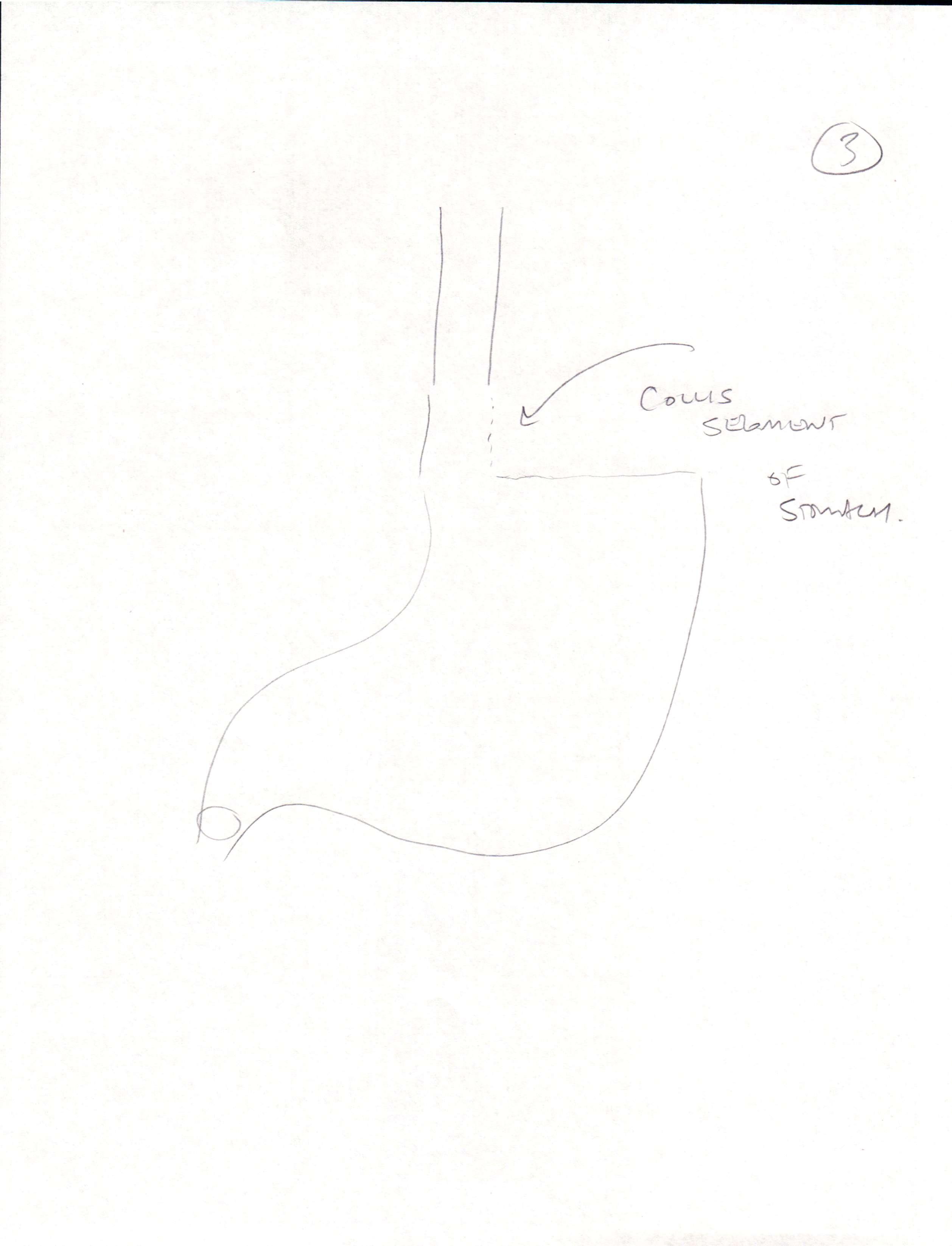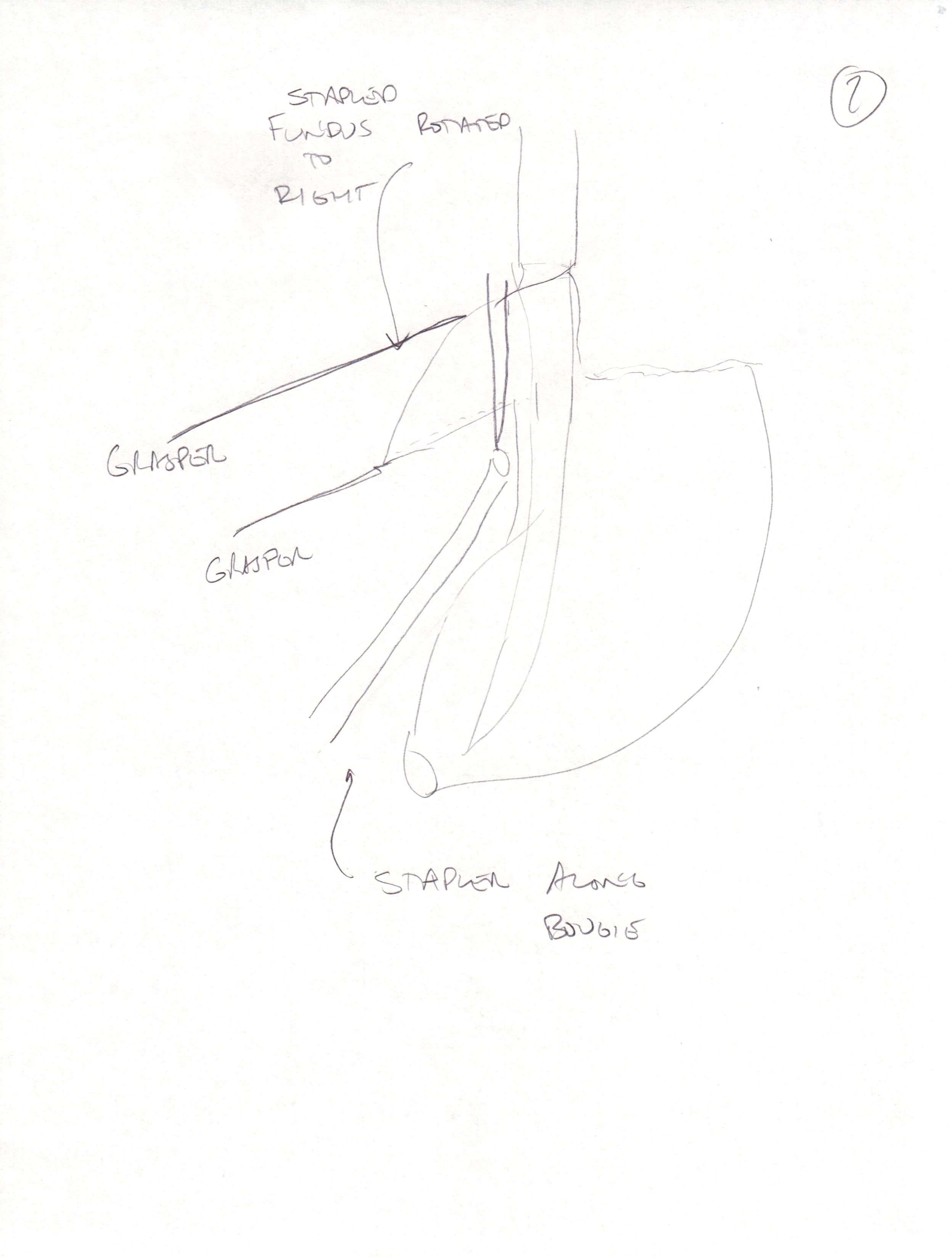 The recognition of a shortened esophagus may require the addition of a Collis gastroplasty to the antireflux repair. The requirement for a Collis gastroplasty may be suspected on the basis of manometric, radiologic, and/or endoscopic findings. However, the final decision is made intraoperatively, after takedown of the previous repair and complete mobilization of the esophagus into the mediastinum. If less than 2-3 cm of tension-free intra-abdominal esophagus is present, a Collis gastroplasty should be performed.[22] A Maloney esophageal bougie (typically 56 Fr) is placed by the surgical team across the gastroesophageal junction along the lesser curve. A wedge gastroplasty is then performed. With the bougie in place, the fundus of the stomach is grasped with one grasper at the Angle of His and a grasper placed further down on the greater curve and the fundus rotated to the right upper quadrant. An Endo GIA stapler is introduced into the abdomen, with the first row of stapler firings coming across the superior portion of the fundus up to the bougie (Figure 8). The next row of staples comes along the bougie to amputate the wedge of fundus and create the segment of neo-esophagus. To accomplish this, the portion of fundus to be removed is held up with two graspers, while the residual fundus rotates back to the right. A stapler is then fired along the length of the bougie, removing the wedge of stomach (Figure 9, 10).