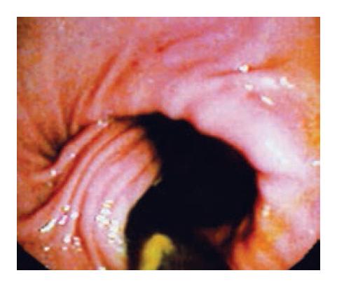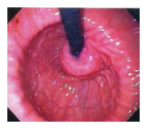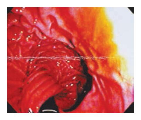 Upper gastrointestinal endoscopy is performed to assess for esophagitis, stricture, gastritis, ulceration, or tumor and to evaluate the position and integrity of the wrap. This is ideally performed before surgery. An intact fundoplication has the typical “stack of coins” appearance on a retroflexed view with the endoscope (Figure 4). Interpretation of the endoscopic findings to determine the mechanism of the failure requires experience and knowledge. For example, the presence of gastric mucosa above the wrap suggests the possibility of a slipped Nissen fundoplication. Alternatively, a widely patent gastroesophageal junction viewed on retroflexion of the endoscope positioned in the stomach suggests that the cause of recurrent symptoms may be attributed to a loose or disrupted wrap. In addition, other abnormalities such as twisted fundoplication or a two-compartment stomach may be noted (Figures 5 and 6). Identifying the squamocolumnar junction and its relation to the diaphragmatic crura can help make an assessment of esophageal length.