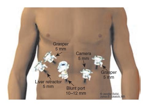 Initial port placement is performed with direct peritoneal visualization. A key technical point is that the first laparoscopic port inserted is placed away from any previous incisions. Regardless of location, an open technique is used for placement of the first port. Once a laparoscopic view of the peritoneal cavity is obtained, adhesiolysis is performed in the upper abdomen to allow usual port placement used for laparoscopic antireflux surgery. If dense adhesions are encountered, we generally add a more inferior and lateral port to allow better visualization and assist with the lysis of adhesions. After complete lysis of adhesions, we convert to our standard five (two 10-mm and three 5-mm) access ports (Figure 7).